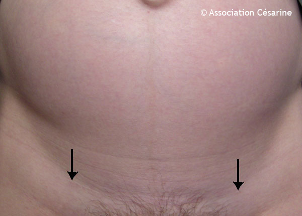 Cicatrice après 1 césarienne, datant de 3 ans, refermée avec surjet intradermique (fil résorbable).