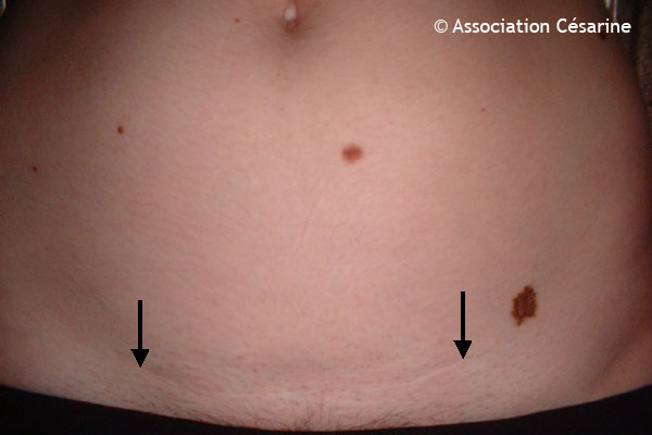 Cicatrice après 1 césarienne, datant de 5 ans, refermée avec des agrafes.